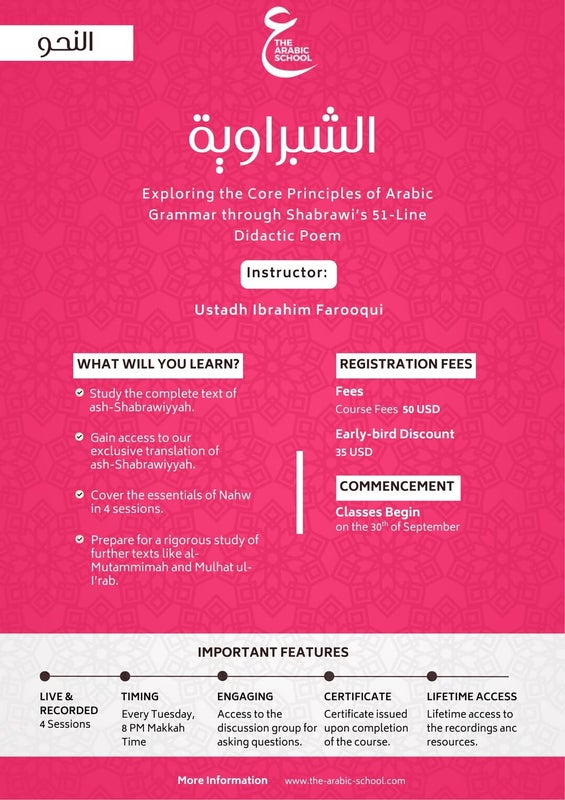 This course covers ash-Shabrawiyyah — Shabrawi’s 51-line didactic poem — providing a concise introduction to the core principles of Arabic grammar (Nahw).